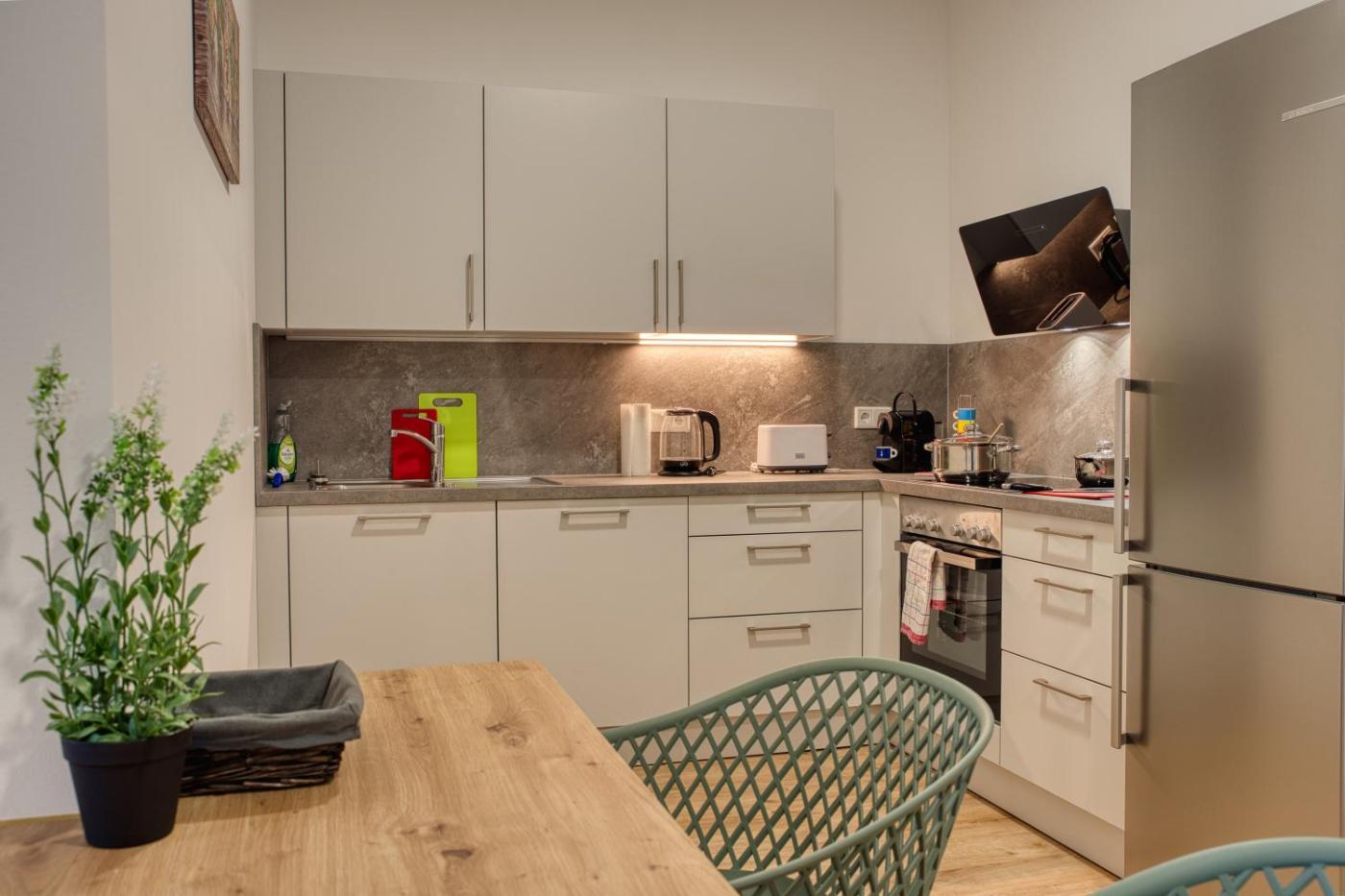 Apartment mit 2 Schlafzimmern. This spacious apartment is comprised of 1 living room, 2 separate bedrooms and 1 bathroom with a walk-in shower and a hairdryer. The well-fitted kitchen features a stovetop, a refrigerator, a dishwasher and kitchenware. The apartment has parquet floors, a seating area with a flat-screen TV, a tea and coffee maker, a dining area, as well as a sofa. The unit offers 4 beds.