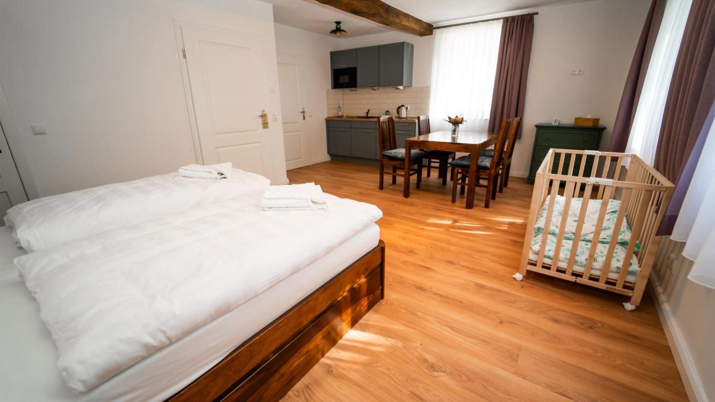 Doppelzimmer mit Gartenblick. The double room offers a wardrobe, parquet floors, as well as a private bathroom boasting a shower and a hairdryer. Guests can make meals in the kitchenette that features a refrigerator, kitchenware and a microwave. The spacious double room features a tea and coffee maker, a seating area, a dining area, a flat-screen TV with streaming services, as well as garden views. The unit has 1 bed. ;