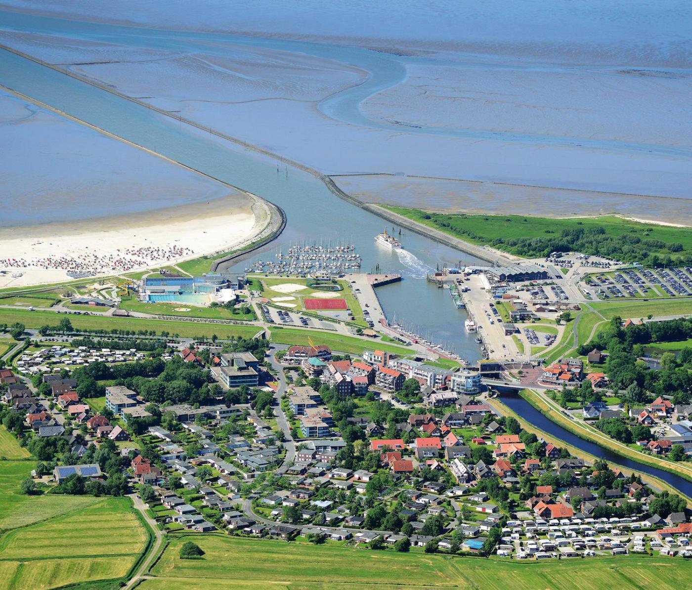 Das Aquantis liegt in der Nähe des Hafens von Bensersiel, hier werden Fährverbindungen zur ostfriesischen Insel Langeoog angeboten.