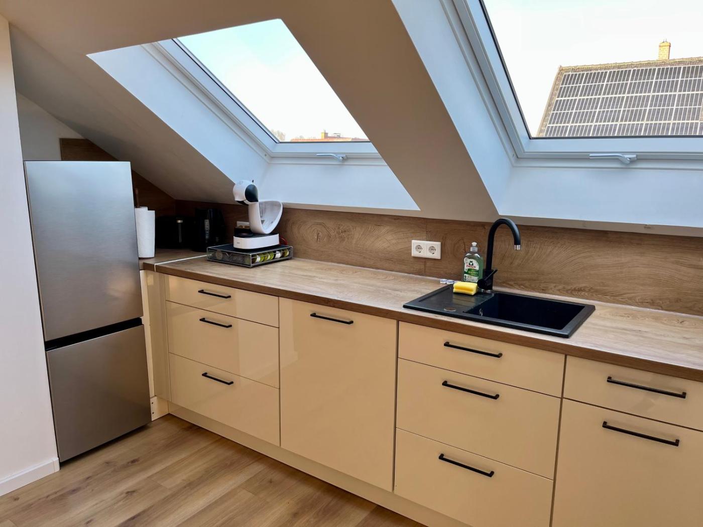 Diese Ferienwohnung besteht aus 1 Schlafzimmer, einem Wohnzimmer, einer voll ausgestatteten Küchenzeile mit einem Kühlschrank und einer Kaffeemaschine sowie 1 Badezimmer mit einer Dusche und einem Haartrockner. In dieser Ferienwohnung werden Handtücher und Bettwäsche zur Verfügung gestellt.
