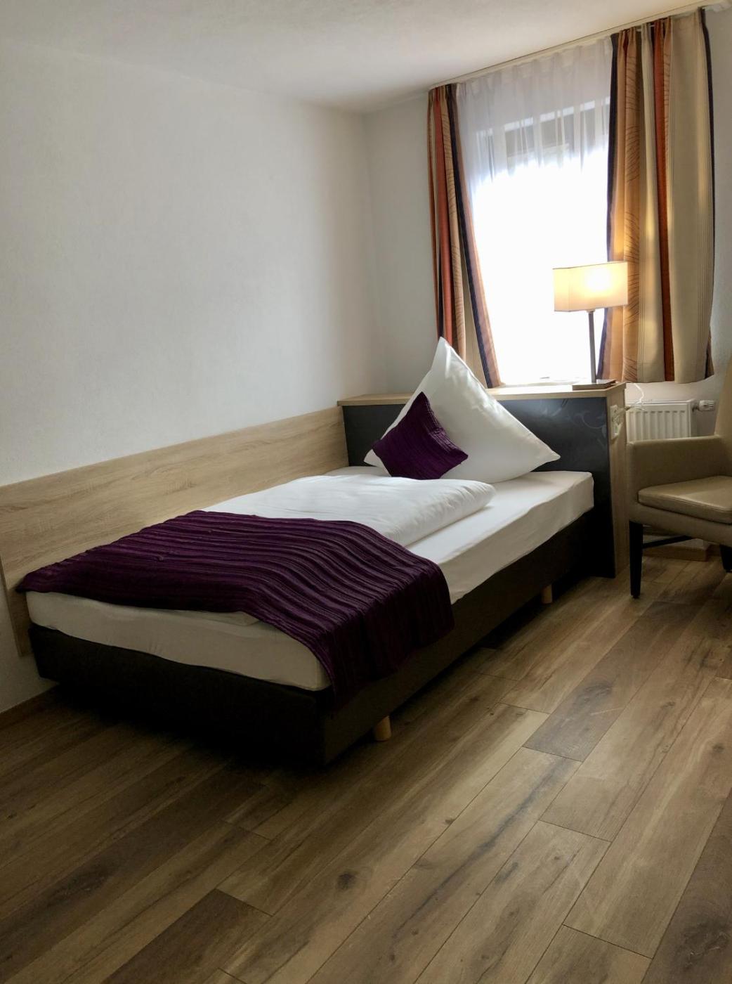 Einzelzimmer. The single room features a private bathroom, a private entrance, a minibar, as well as a seating area with a flat-screen TV. The single room has parquet floors and provides a dining area, a wardrobe and city views. The unit offers 1 bed. ;