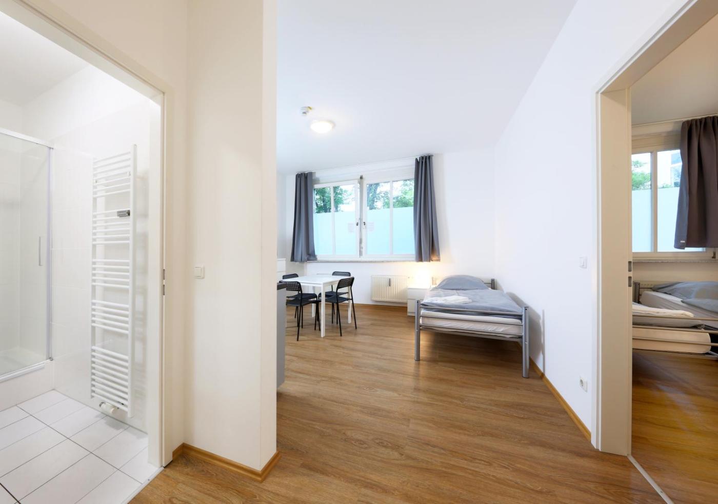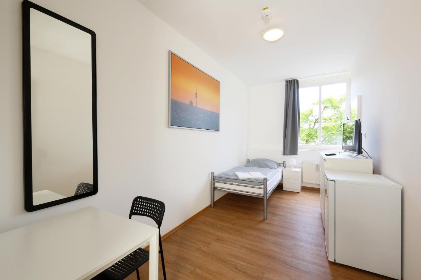 Einzelzimmer mit eigenem Bad. The single room features an electric kettle, heating, as well as a private bathroom boasting a shower. The single room has tiled floors, a seating area with a flat-screen TV, a washing machine, a dining area as well as city views. The unit has 1 bed. ;