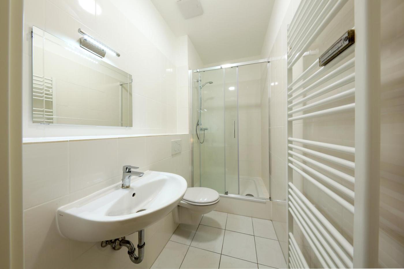 Zweibettzimmer mit eigenem Bad. The twin room offers an electric kettle, heating, as well as a private bathroom featuring a shower. The twin room features tiled floors, a seating area with a flat-screen TV, a washing machine, a dining area as well as city views. The unit offers 2 beds. ;