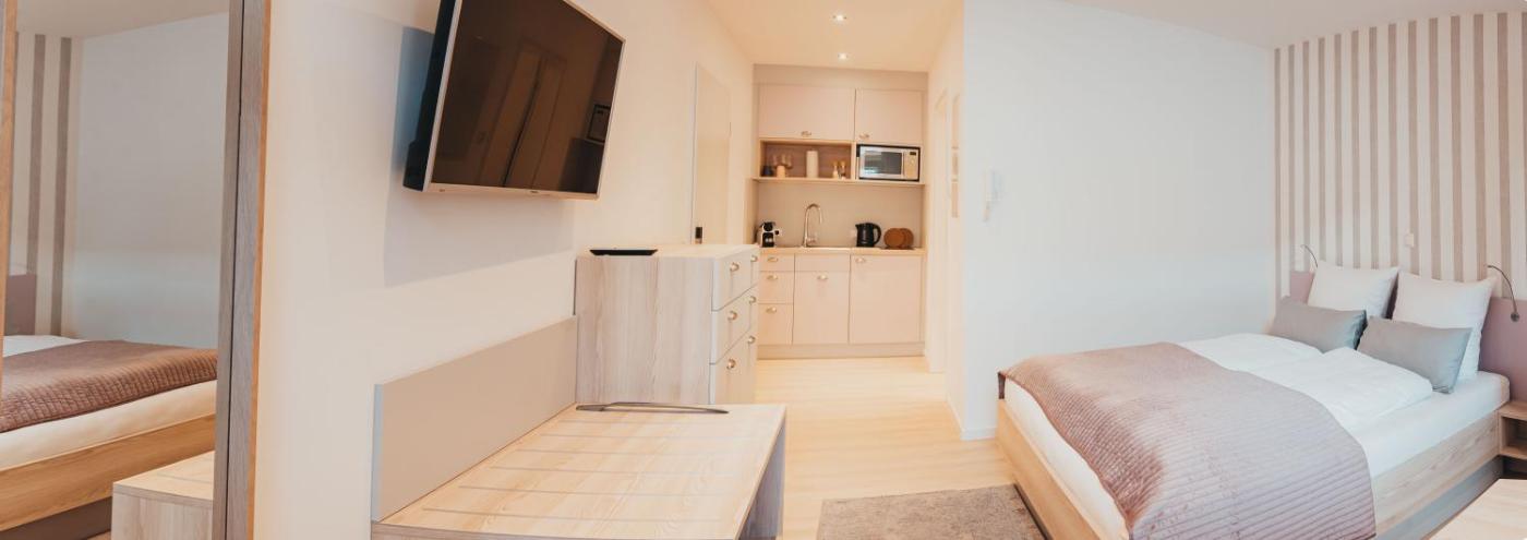 Doppel- oder Zweibettzimmer. The twindouble room features a tea and coffee maker, a seating area, as well as a private bathroom boasting a walk-in shower and a hairdryer. In the well-fitted kitchen, guests will find a stovetop, a refrigerator, kitchenware and a microwave. This twindouble room has a wardrobe, heating, a flat-screen TV with satellite channels and city views. The unit has 2 beds. ;