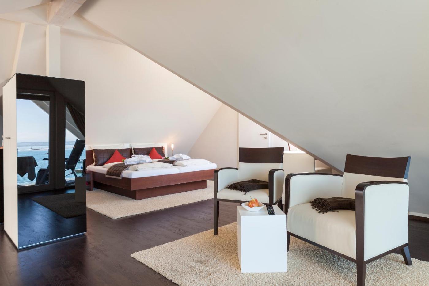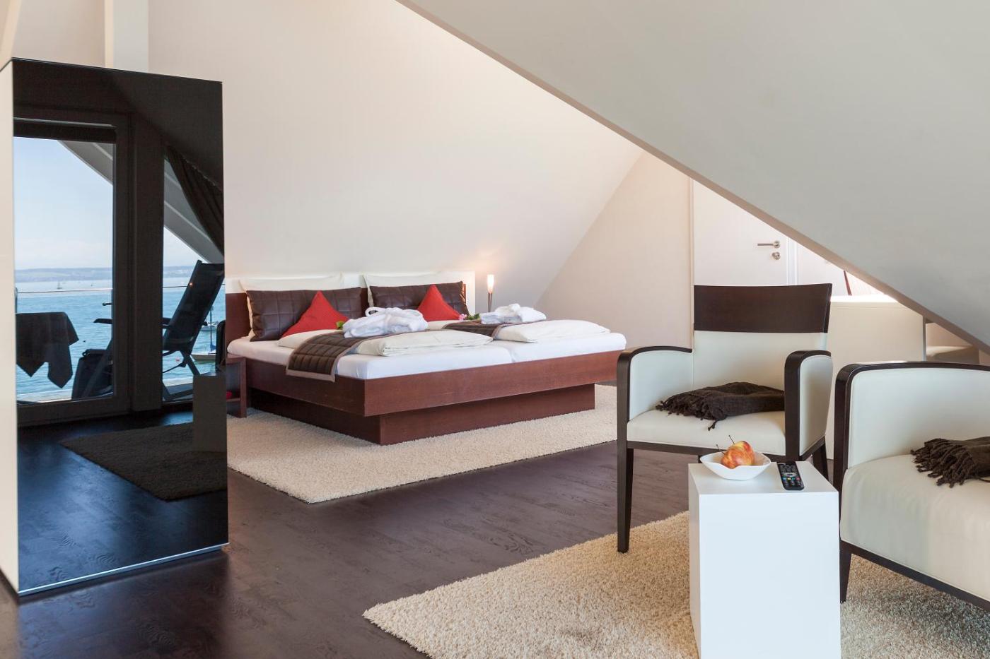 Studio mit Balkon und Seeblick. Diese Zimmerkategorie besteht aus 1 von 2 Studios: 1) Dem hellen und geräumigen Studio mit Parkblick (60 m²) mit Sat-TV, schönen, modernen Möbeln und einem eigenen Bad mit einer Dusche. Es verfügt über einen eigenen Balkon gen Südosten mit Aussicht auf den Kurpark, den Osthafen und den Bodensee. 2) Dem kleineren Studio mit Seeblick, das sich im Dachgeschoss befindet (kein Aufzug vorhanden). Es verfügt über hochwertige Möbel, einen eigenen Balkon und direkte Aussicht auf den Bodensee. ;