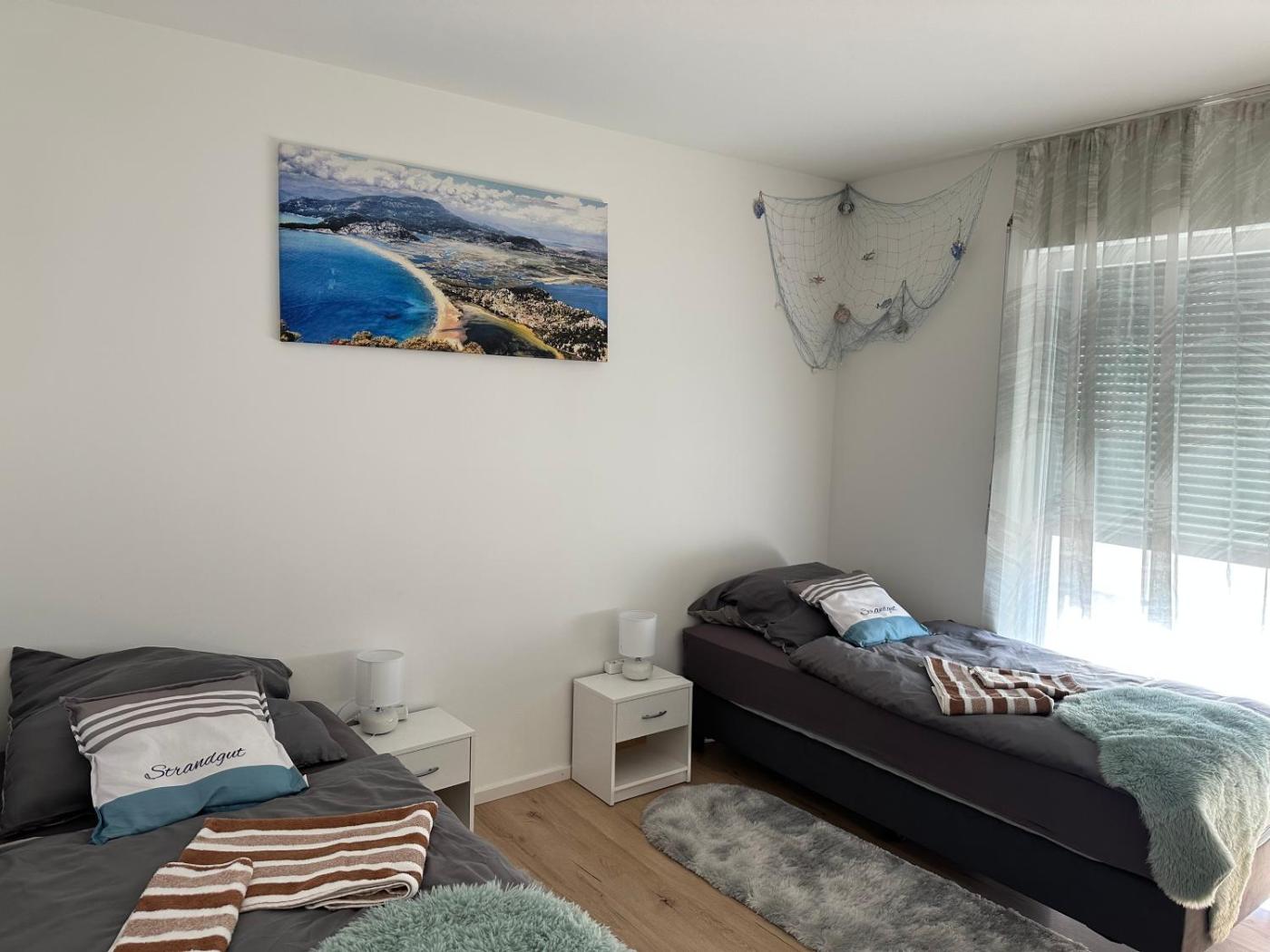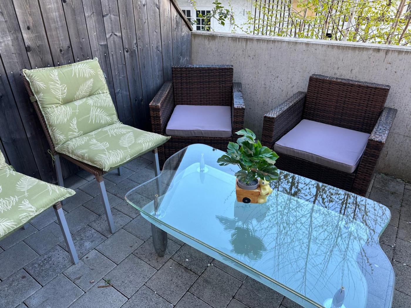 Zweibettzimmer mit Gemeinschaftsbad. The spacious twin room provides a seating area, a dining area, a terrace with garden views as well as a shared bathroom featuring a hairdryer. The unit offers 2 beds. ;