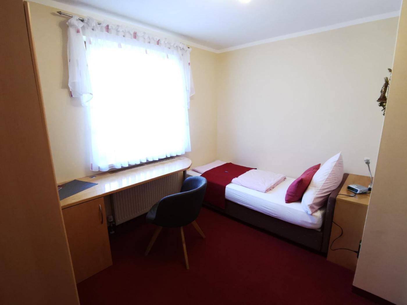 Einzelzimmer mit Terrasse. The single room features a wardrobe, heating, as well as a private bathroom boasting a shower and a hairdryer. The single room has a terrace. The unit has 1 bed.