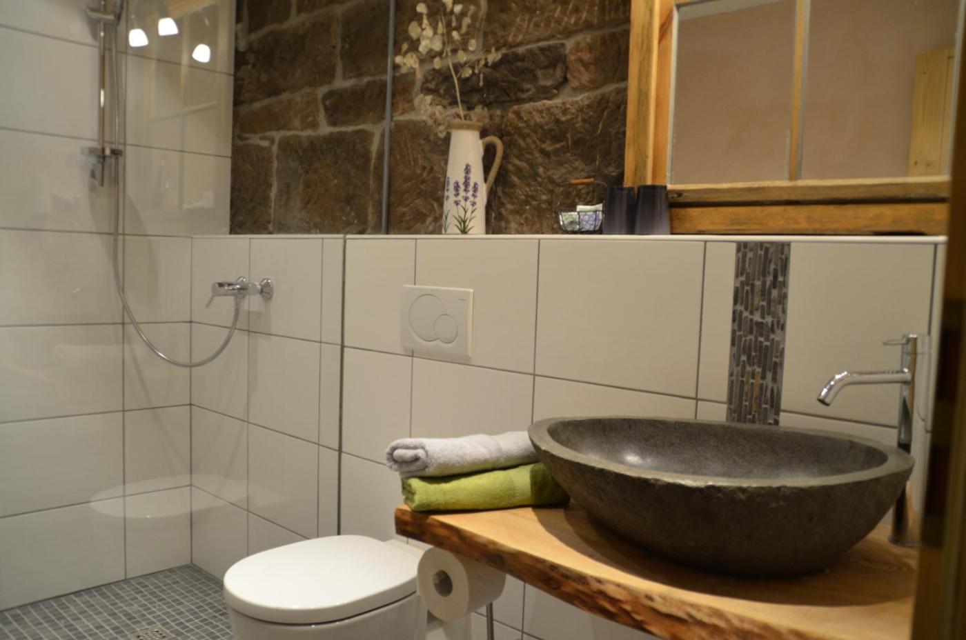 Doppelzimmer. Dieses gemütliche Zimmer verfügt über einen TV, einen Schreibtisch und einen Sitzbereich. Das eigene Bad ist mit Natursteinelementen gestaltet. Die Unterkunft umfasst auch einen Balkon mit Blick auf die umliegende Landschaft.