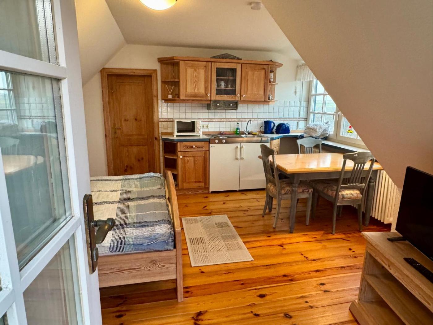 Apartment mit Dusche. Boasting a private entrance, this apartment comes with 1 living room, 1 separate bedroom and 1 bathroom with a shower. The well-fitted kitchenette has a stovetop, a refrigerator, kitchenware and an oven. The apartment features parquet floors, a seating area with a flat-screen TV, a tea and coffee maker, a wardrobe, as well as heating. The unit has 1 bed.