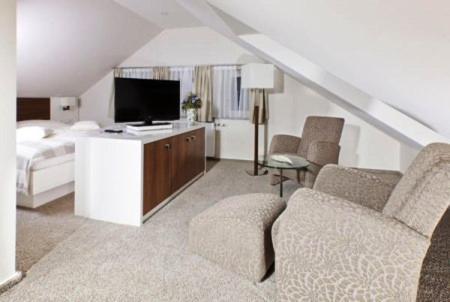 Junior Suite. Helle, moderne Suite mit einer Sitzecke, einem Schreibtisch und einem eigenen Bad mit einer Regendusche. Diese Suite bietet mehr Platz.